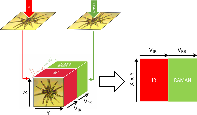 图1所示。概念方案的多通道成像Micrasterias藻类,描绘的红外和拉曼高光谱图像注册创建一个扩展数据矩阵。